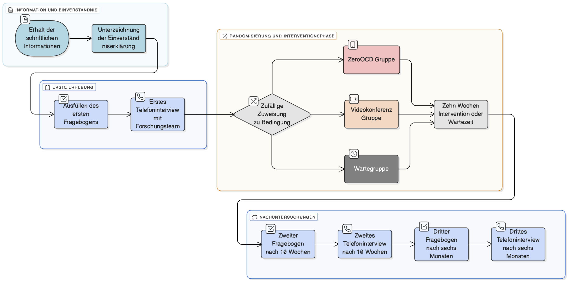 Dazu vergleichen wir die Daten von drei Teilnehmergruppen: Die erste Gruppe erhält eine KVT-basierte Augmented-Reality-Smartphone-App (9 Module à 5–20 Minuten und 10 Minuten tägliche Übungen) sowie 3 Beratungssitzungen per Videocall über einen Zeitraum von 10 Wochen. Die zweite Gruppe erhält 9 wöchentliche Online-Beratungen mit kognitiv-verhaltenstherapeutischen Inhalten per Videokonferenz. Die dritte Gruppe ist die Wartegruppe, die auf Anfrage nach 10 Wochen Zugang zu ZeroOCD erhält.